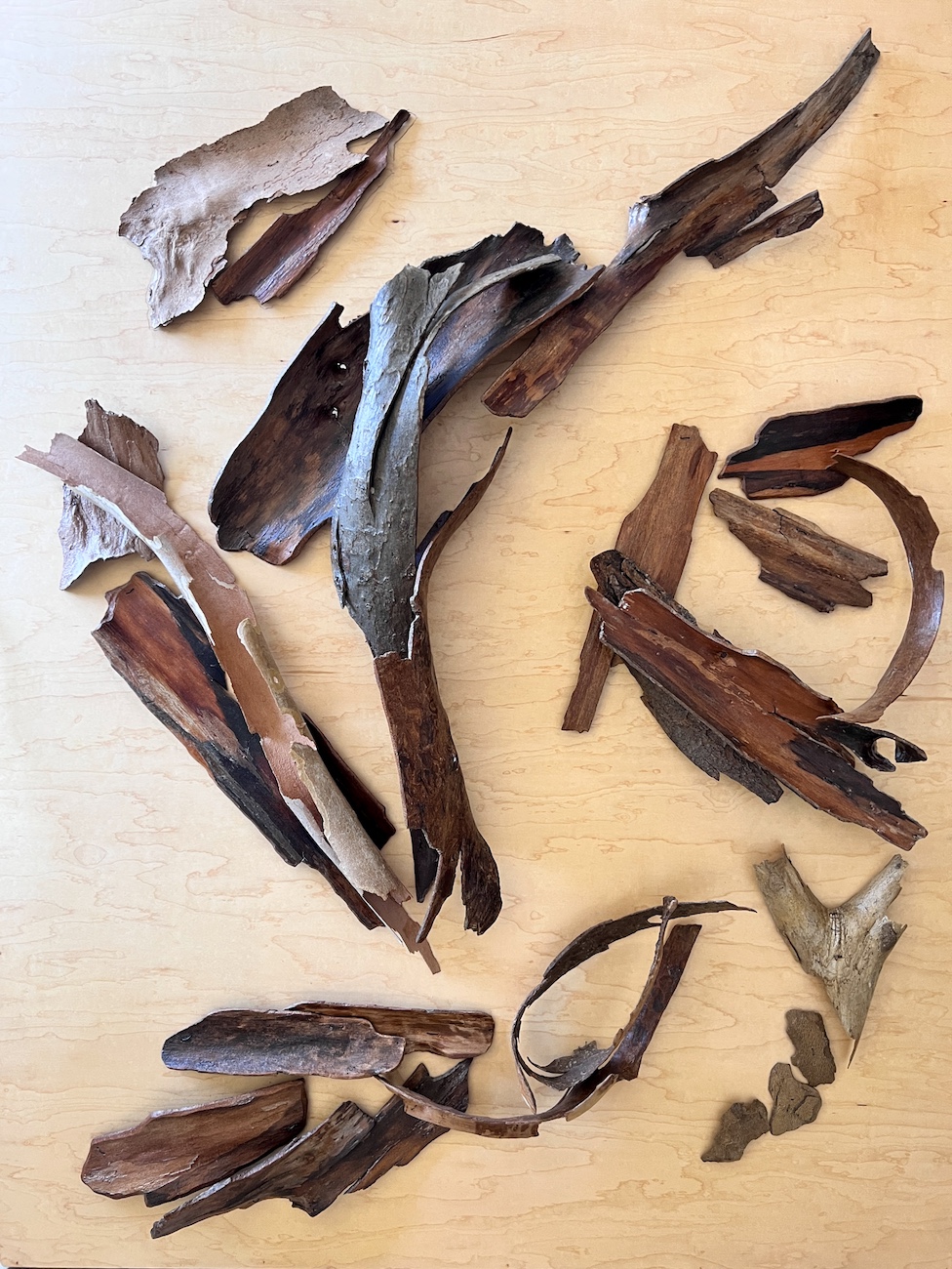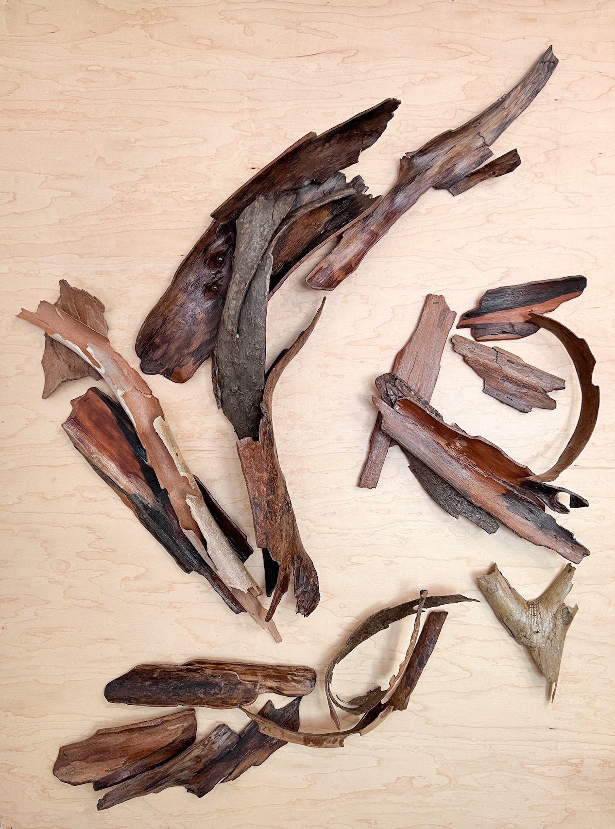 44”W x 60”H x 5.5”D, Wood bark, steel rod, wire, acrylics
