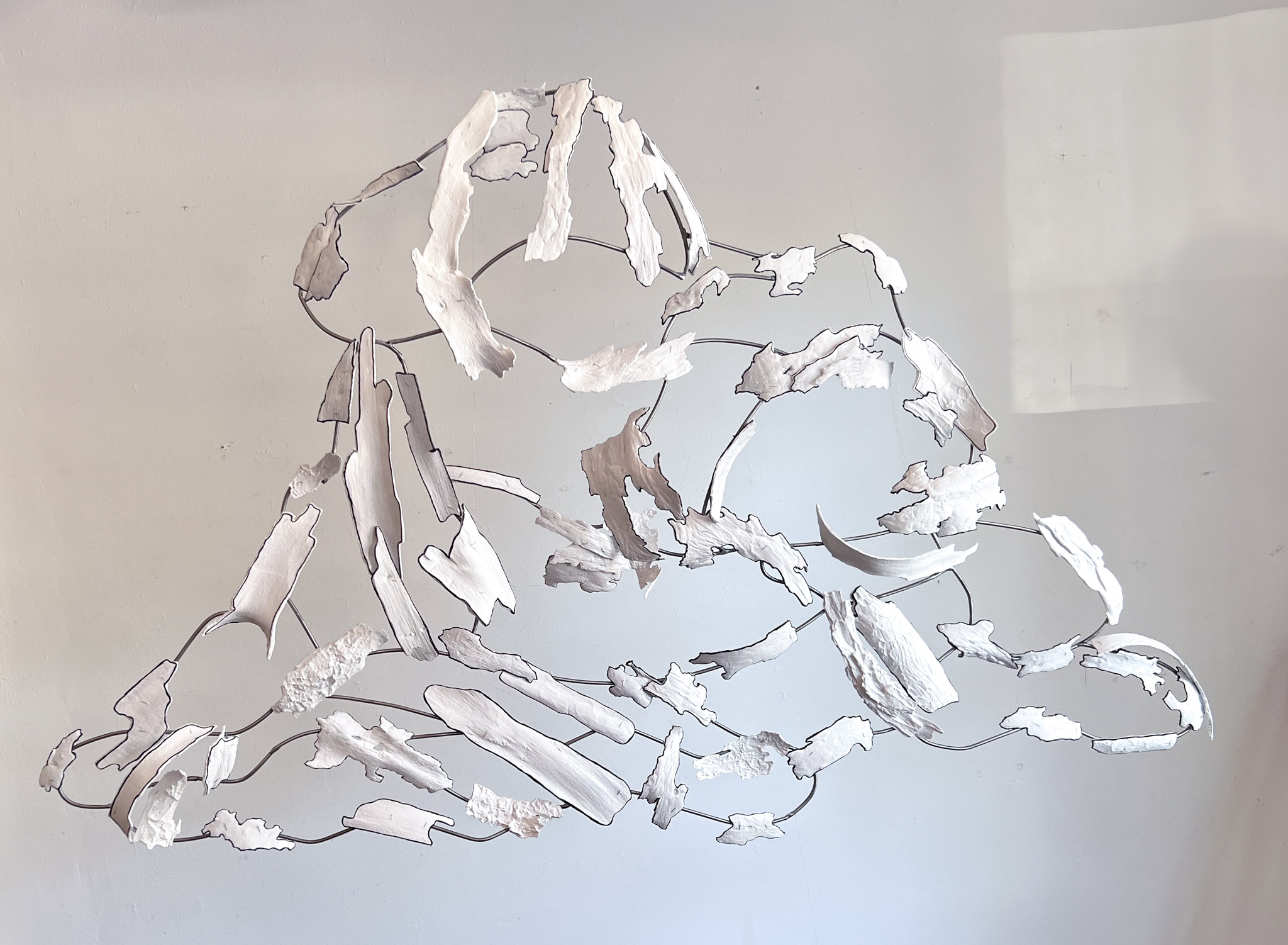 53"W x 31"H x 4.5"D, wood bark, steel rod and wire, 2025